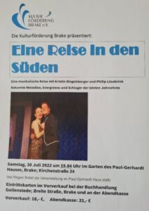 Am Samstag, den 30. Juli, starten wir mit Kristin Riegelsberger und Philip Lüsebrink in den Süden. Bekannte Opernarien, schwungvolle Operettenlieder und Schlager aus vielen Jahrzehnten sind zu hören.